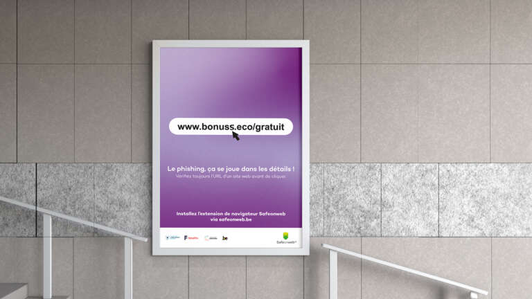 Une activation live audacieuse a donné le coup d'envoi de la campagne lors d'une conférence de presse à Bruxelles. Fidèles au slogan « Le phishing, ça se joue dans les détails », nous avons créé une URL géante de safeonweb.be, en la modifiant d’une simple lettre. Mais la véritable surprise est venue lorsqu'un « phisher », caché dans la mise en scène de l’URL, a soudain pris vie, se faufilant parmi le public et laissant les spectateurs stupéfaits. Un moment mémorable qui a parfaitement mis en lumière l'importance de la vigilance, en ligne comme hors ligne.